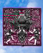 At the center of the bandana is a pig's head, wearing a conquistador hat and that is pierced by a spear. This imagery critiques the violent tactics employed by ICE and law enforcement against migrants seeking a better life. The pig, associated with militarized and racist structures that perpetuate harm in our communities. The spear through its head signifies resistance and the dismantling of these oppressive systems.